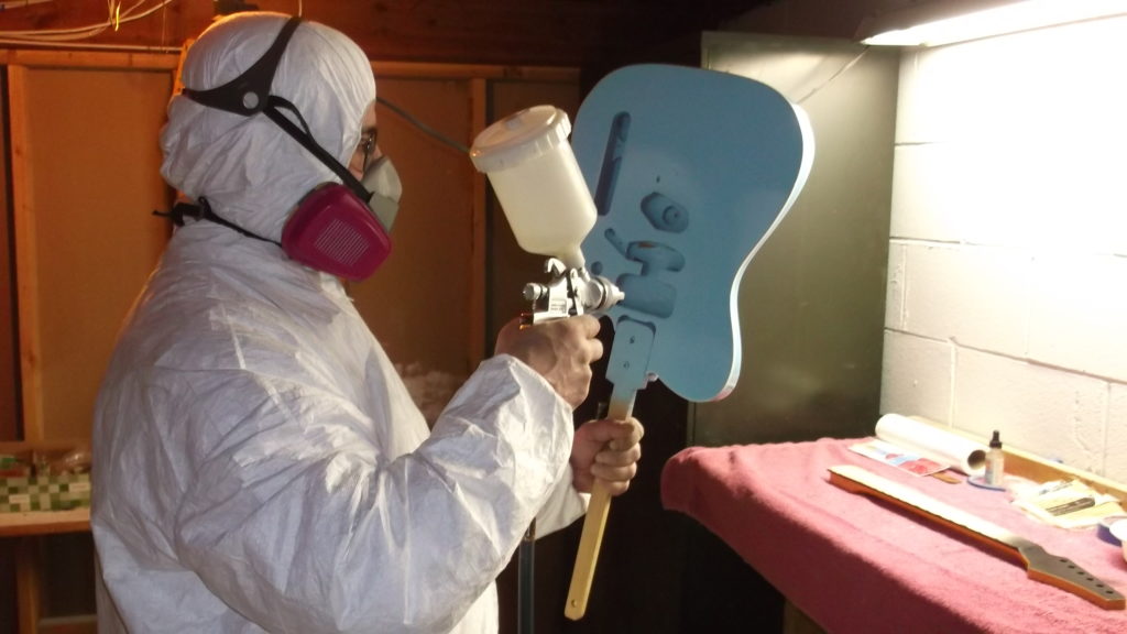 Spraying takes time. Here, I’m putting the first primer coat on this tele restoration. The body will require several coats.
